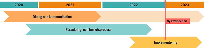 Bild som illustrerar en tidslinje över arbetet med att ta fram Hälso- och sjukvårdsavtal och Färdplan nära vård. Under 2020 och 2021 fördes dialog och kommunikation. Förankring- och beslutsprocess började i slutet på 2020 och har pågått till 2022. Arbetet med implementering startar under 2022 och kommer pågå även under 2023. Ny avtalsperiod börjar i januari 2023