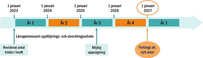 Bild som visar avtalstid för Hälso- och sjukvårdsavtalet 1 januari 2023 Reviderat avtal träder i kraft. Uppföljning/utvecklingsarbete Färdplan Nära vård sker parallellt. År 3 finns möjlighet till uppsägning. 1 januari 2027 förlängs avtalet alternativt tecknas ett nytt avtal.