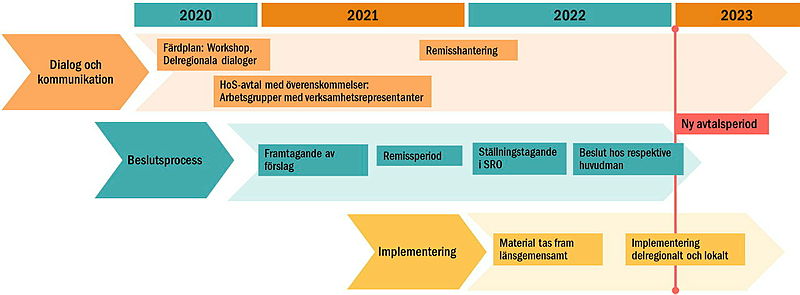 Bild som illustrerar en tidslinje över arbetet med att ta fram Hälso- och sjukvårdsavtal och Färdplan nära vård. Dialog och kommunikation pågår under 2020 med aktiviteterna Delregionala dialoger och workshops för färdplanen, Arbetsgrupper med verksamhetsrepresentanter för Hälso- och sjukvårdsavtalet med överenskommelser och remisshantering. Beslutsprocessen pågår under 2021 till 2020 med aktivteterna: framtagande av förslag, remissperiod, ställningstagande i Politiskt samrådsorgan och beslut hos respektive huvudman. Implementeringen börjar under 2022 med aktiviteterna: material tas fram länsgemensamt, implementering delregionalt och lokalt.